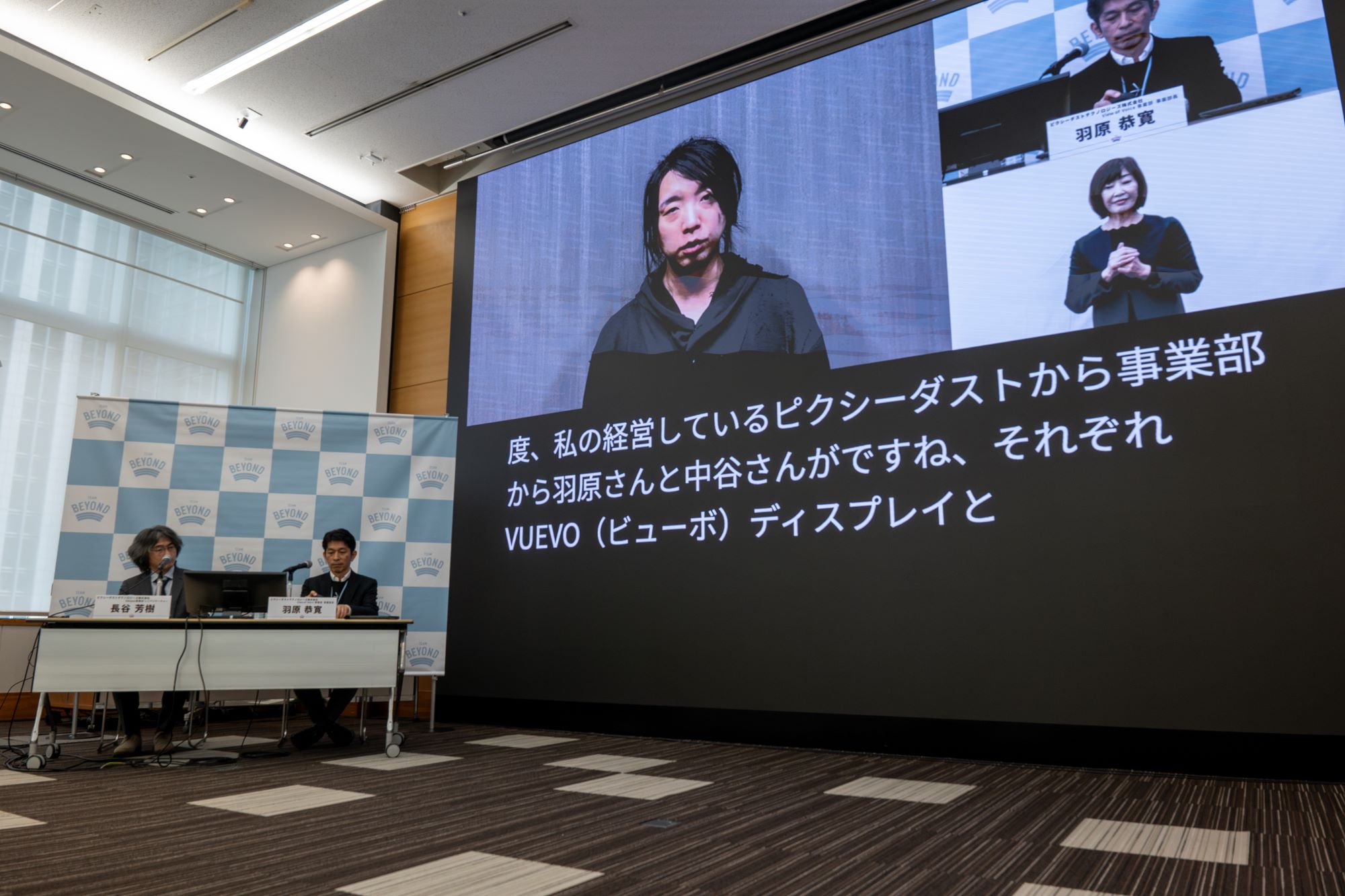 冒頭に創業者である代表取締役会長CEOの落合陽一氏がVTR出演し、ピクシーダストテクノロジーズの製品であるVUEVO DisplayとSOUND HUGについて説明した上で、「本製品を経由して、人の多様性、社会に技術をもって貢献しています。是非ご支援よろしくお願いします」と述べました。