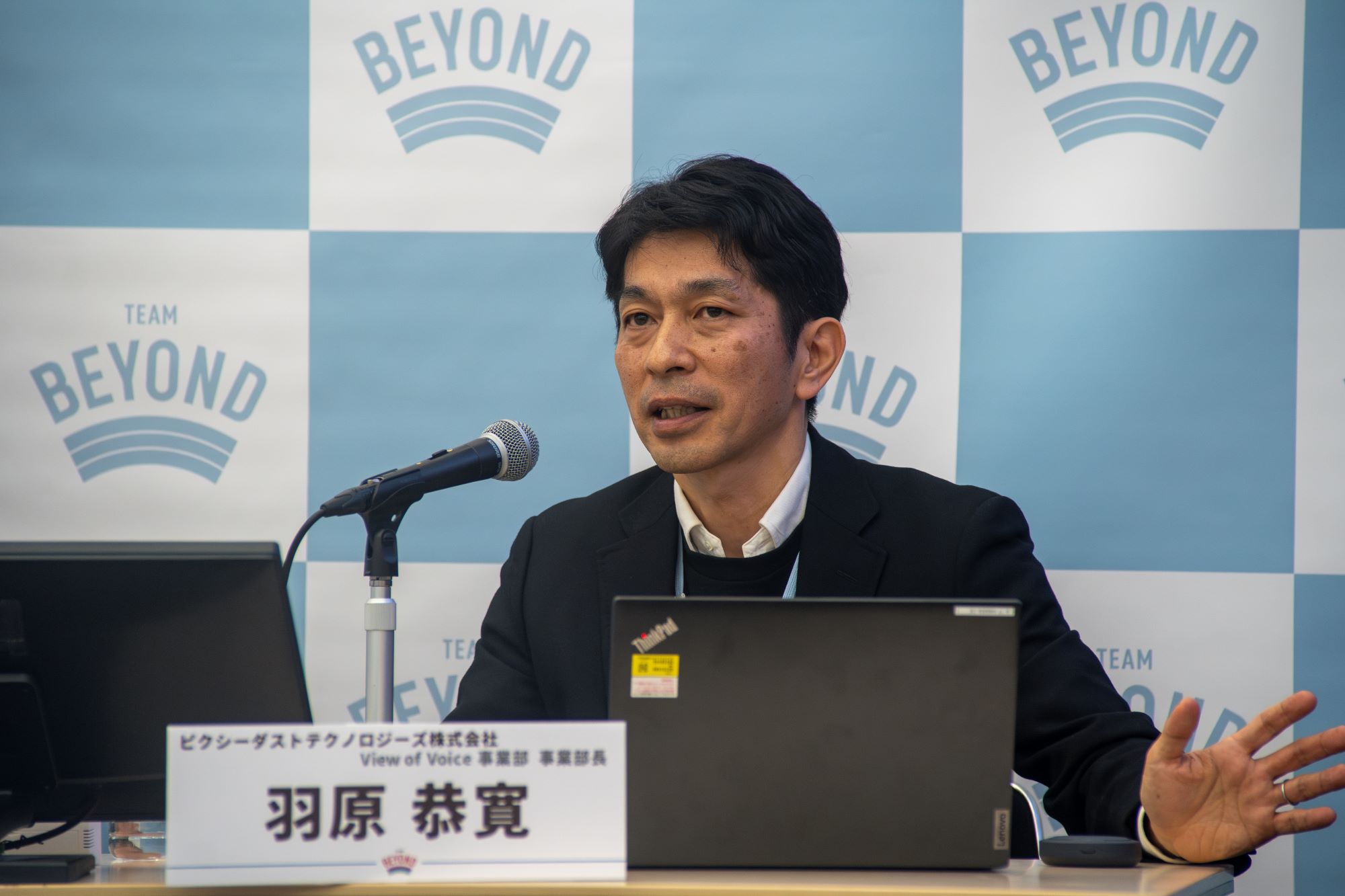 続いて、View of Voice事業部の羽原恭寛事業部長からVUEVOについて、「聴覚障がい者と健聴者の間のコミュニケーションで起こる『聞こえのちがい』、国により言葉がちがう『言語の壁』、生活環境や年齢のちがいが生み出す『文化の壁』、人それぞれの知識や経験のちがいから生まれる『情報の壁』といった色々なバリアを取り払い、誰もが自然とコミュニケーションをとれる世界を目指しています」と語りました。