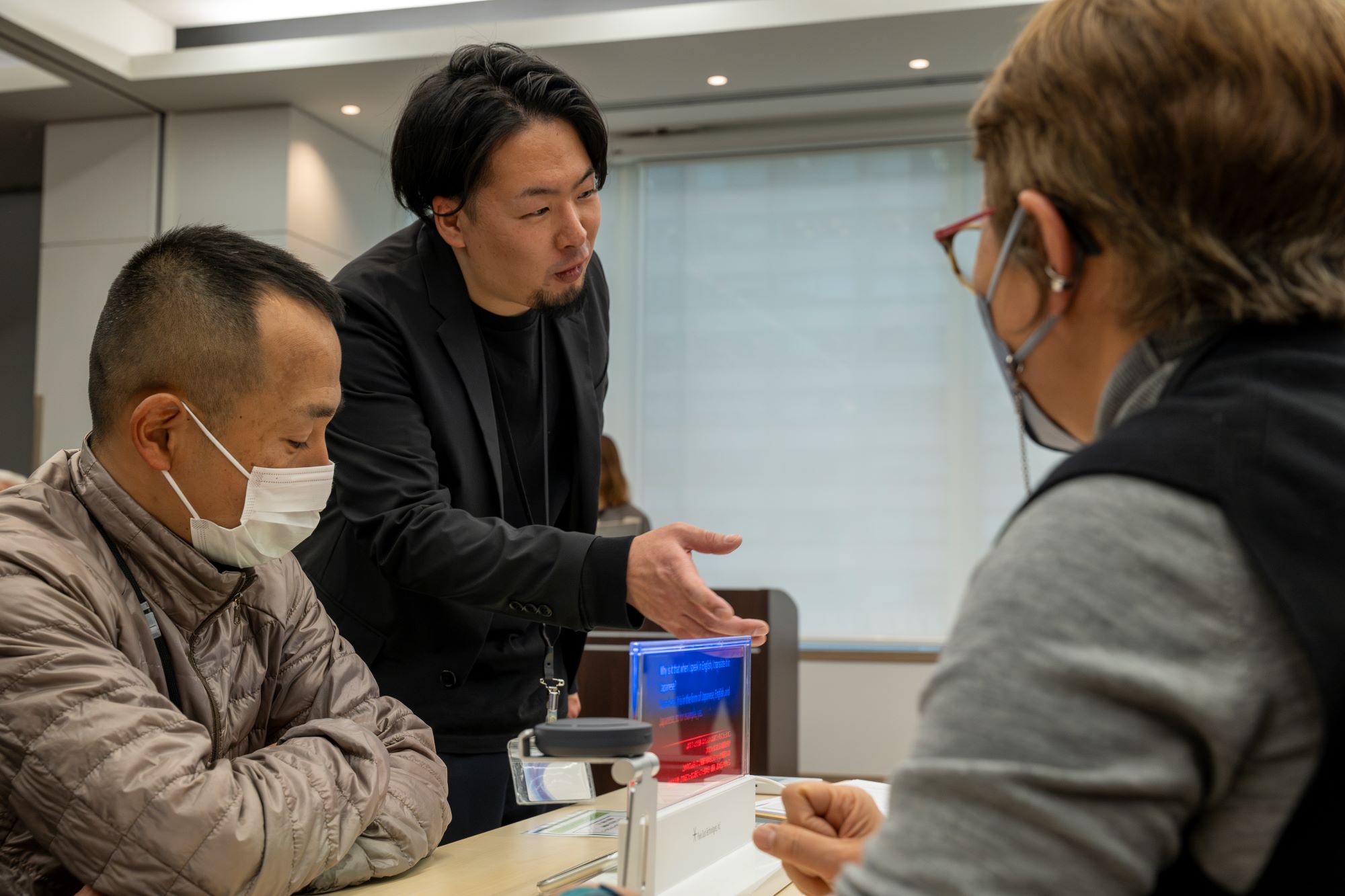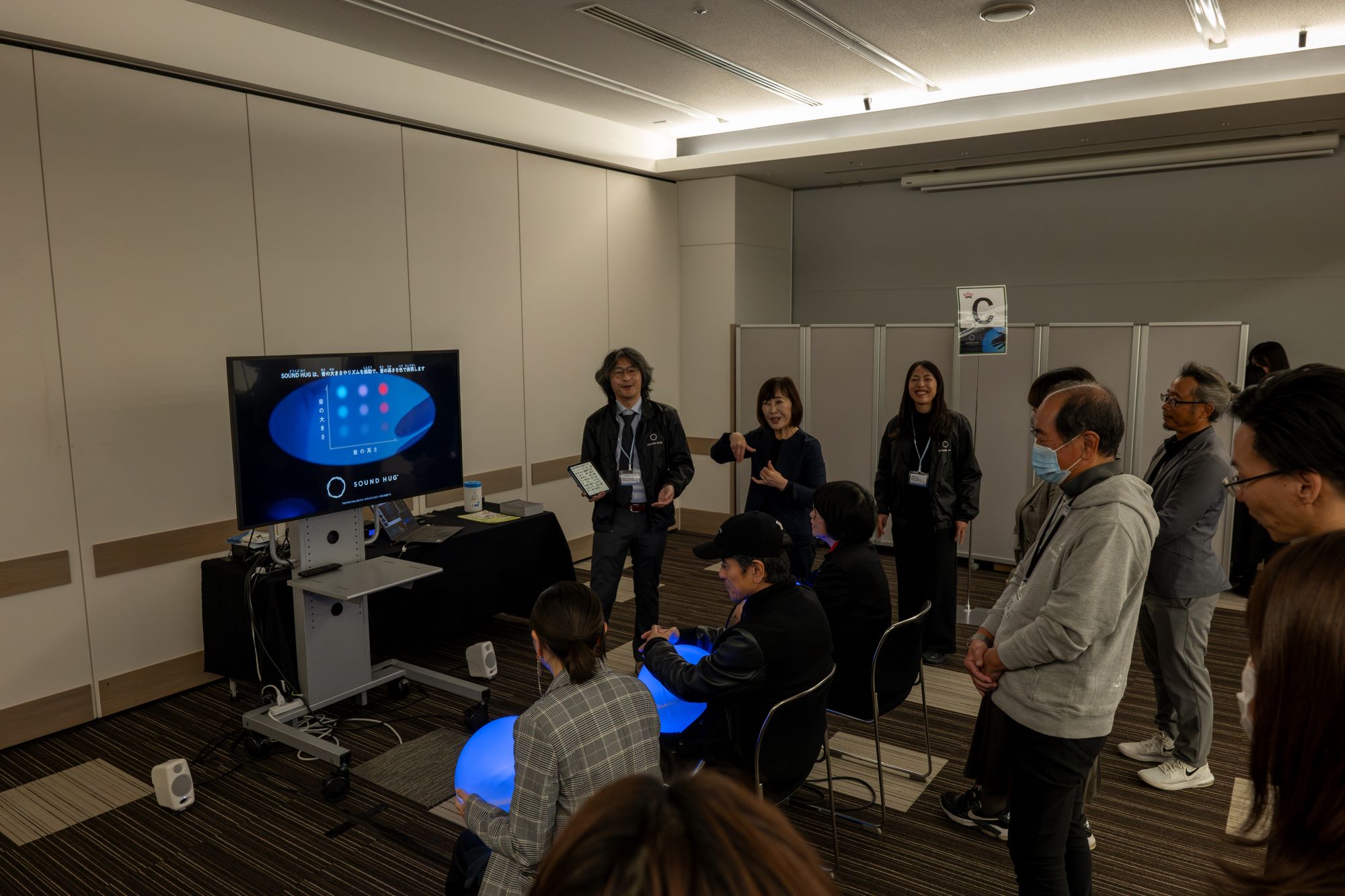 事例紹介の終了後に休憩時間を挟み、参加者の皆さんによる交流会がスタートしました。交流会では「音声を視覚や触覚に変える!新たなコミュニケーション体験」と題し、参加者間の自由交流が円滑に進むように、まずは、ピクシーダストテクノロジーズ株式会社の協力のもと、講演内で紹介いただいた三つの製品「VUEVO」「VUEVO Display」「SOUND HUG」を体験できる場が設けられました。