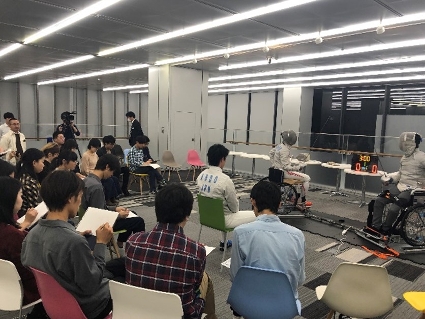 実は、このイベント担当も天利さんでした。例えば、法政大学のフェンシング選手と、パラフェンシング日本代表で東京地下鉄株式会社(東京メトロ)所属の安直樹(やす なおき)さんが車いすフェンシングで対戦し、その様子を学生たちがイラストに描くコンテストを実施。