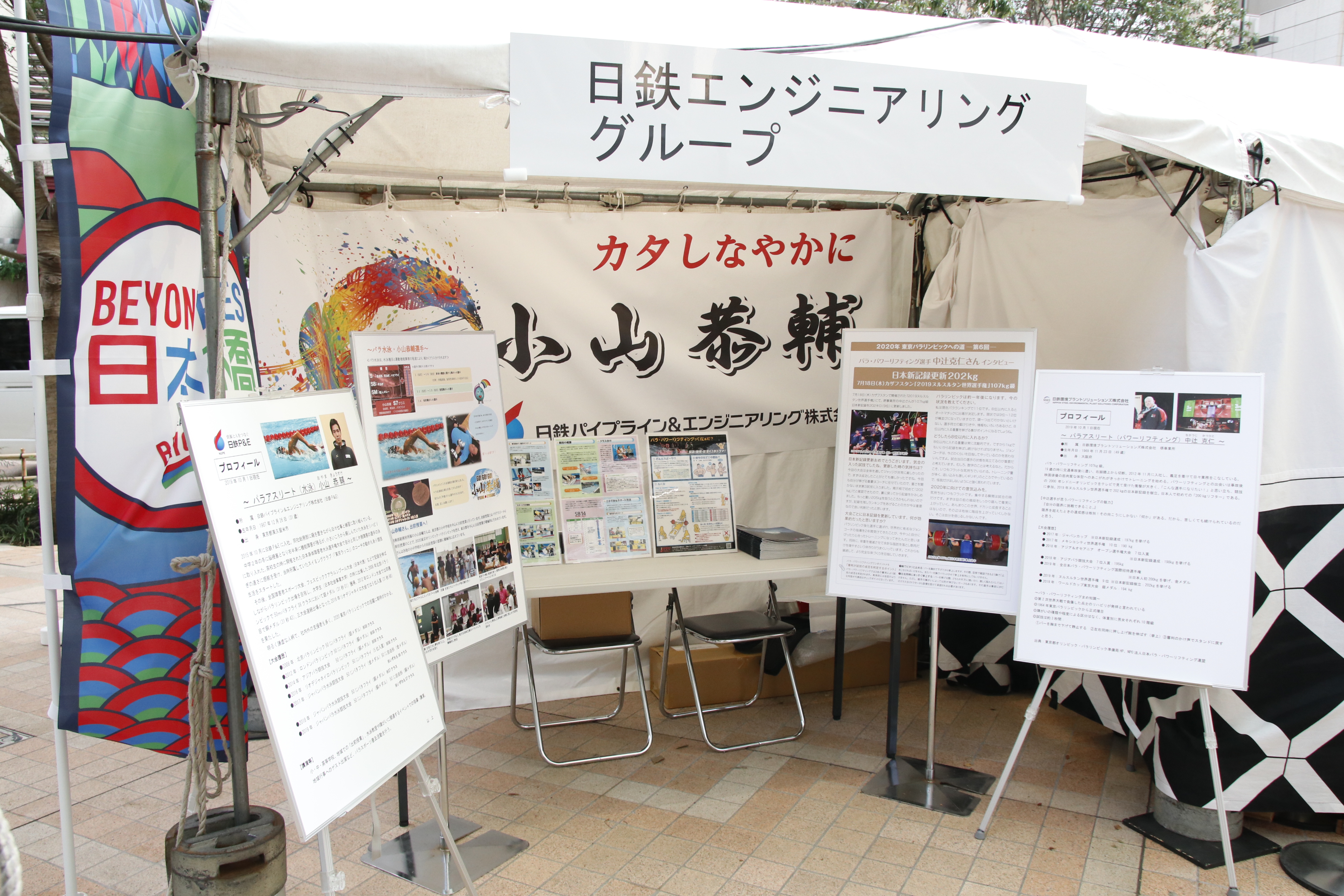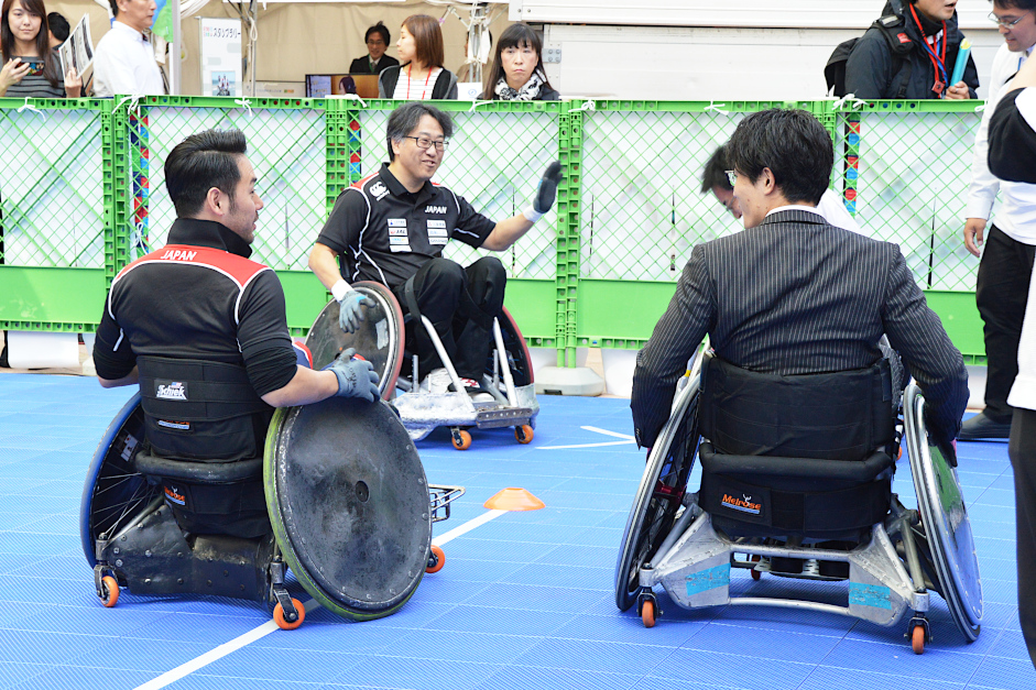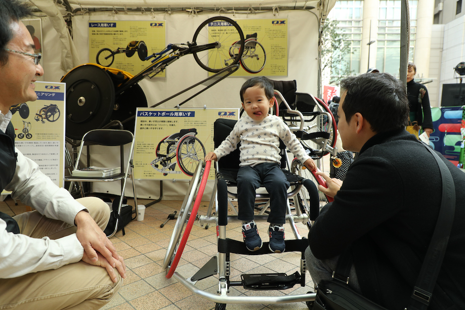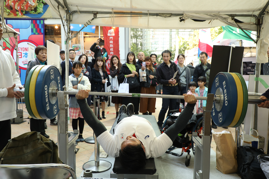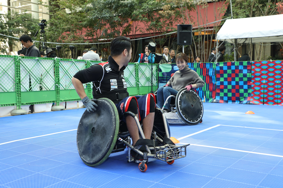 選手からの本番さながらのタックルが受けられる「車いすラグビー体験会」では、朝からイベントに足を運んでいた方に加えて、ランチの休憩時間に訪れた日本橋近隣にお勤めの会社員の方の姿も。また、パドリングマシーン(エルゴ)を使った「パラカヌー体験」では、小さなお子さんも果敢に記録に挑戦していました!