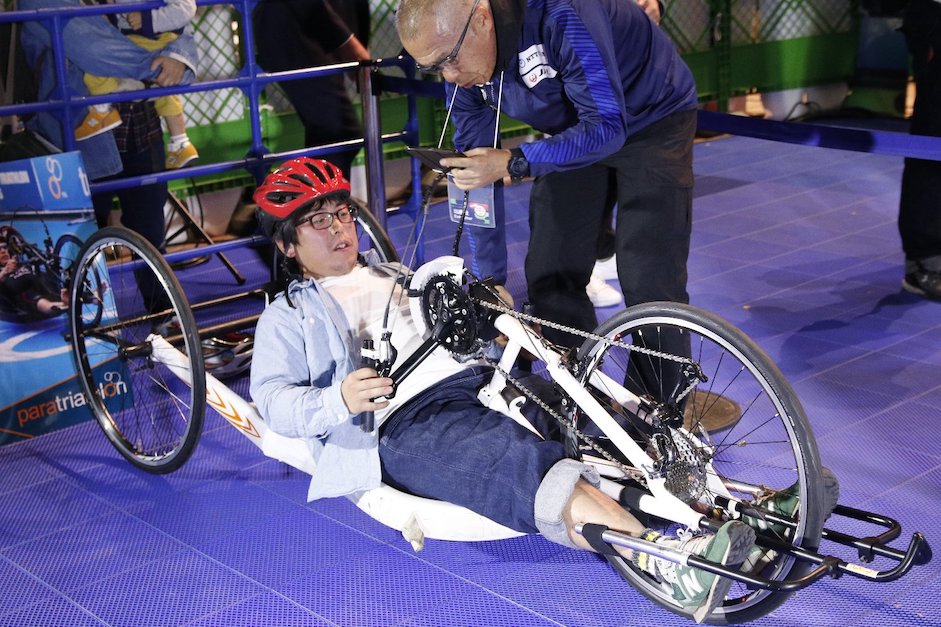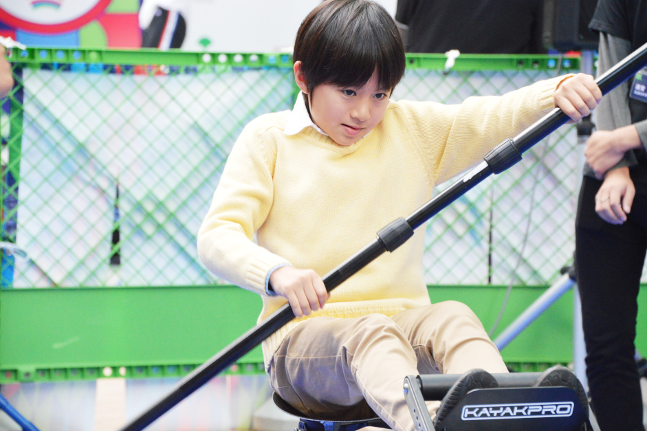 加治選手は直前まで行われていたパラカヌー体験にも参加。エルゴメーター(トレーニングマシーン)を漕ぐ際の力強さ、スピードには一般の参加者の方から拍手が沸き起こっていました。