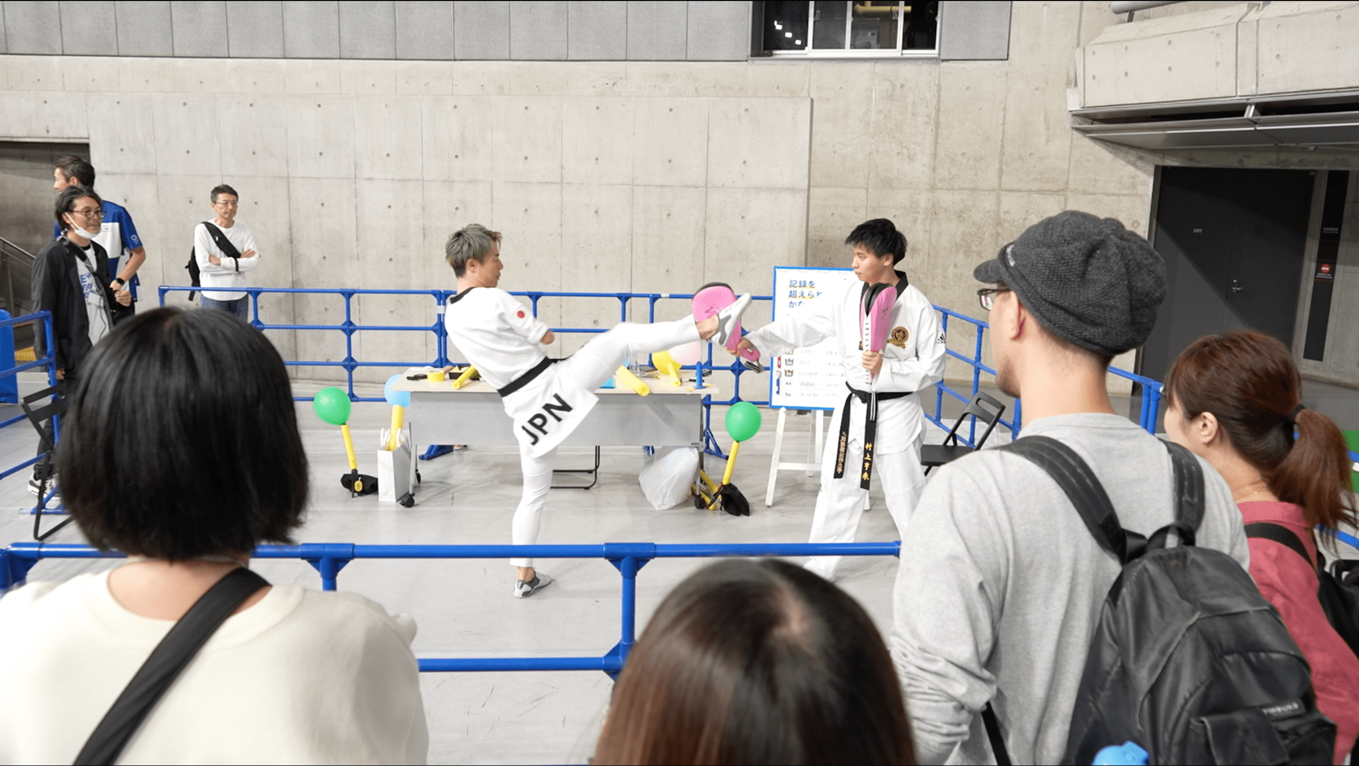 足技で戦うパラテコンドーでは、足を正確にコントロールする力がとても重要です。ここで体験できる“パラトレ”は、膝の高さくらいの風船を10回連続でまたいだ秒数を競う「風船回し蹴り!コントロールチャレンジ」。阿渡選手の記録に追いつけ!追い越せ!と子どもたちが夢中になってチャレンジしていました。