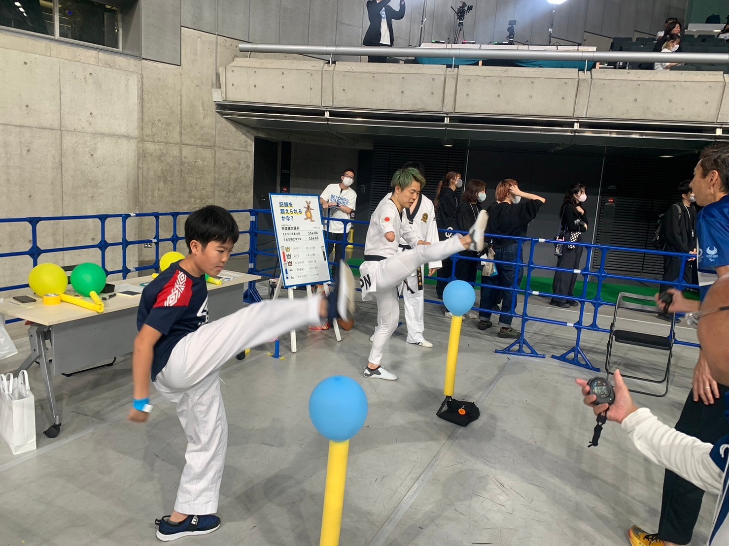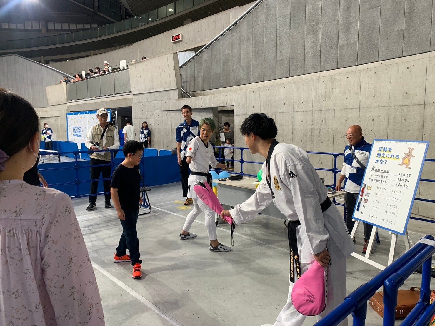 テコンドーのエリアには、パラテコンドー日本代表の阿渡健太選手が登場。デモンストレーションでは、間近で見るキックの勢いと音に子供たちもびっくり!直接アドバイスをもらえる場面も。
