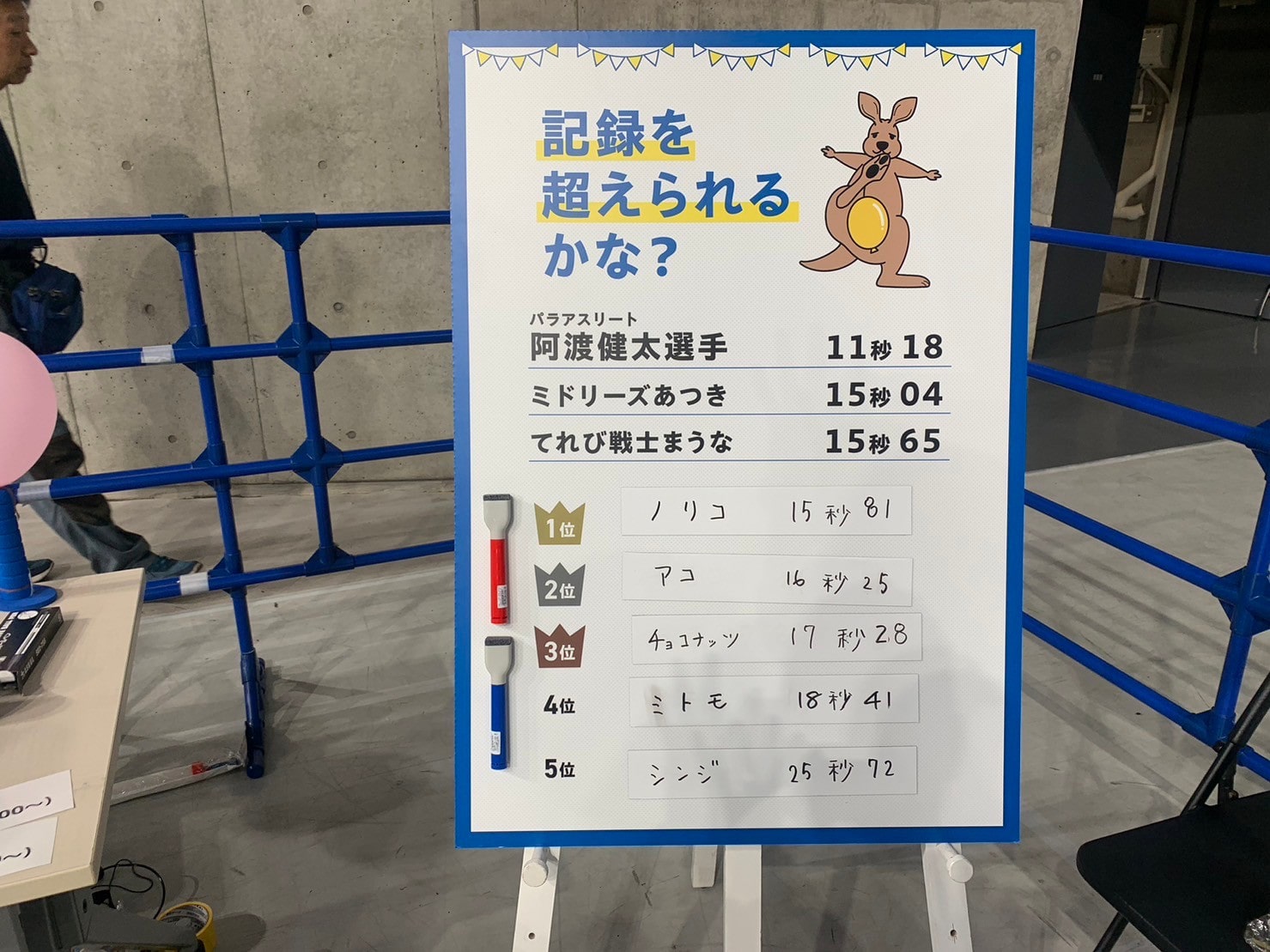 “パラトレ”は2種類のチャレンジ。ひとつは、ボールに触れて10秒以内に相手コートへボールを返さないといけないというルールを元にした「10秒ぴったりチャレンジ」。目隠しをしてストップウォッチで10秒ぴったり測れるかに挑戦しました。なかにはピタリ賞の方も。まさにアスリートのような正確な時間感覚!