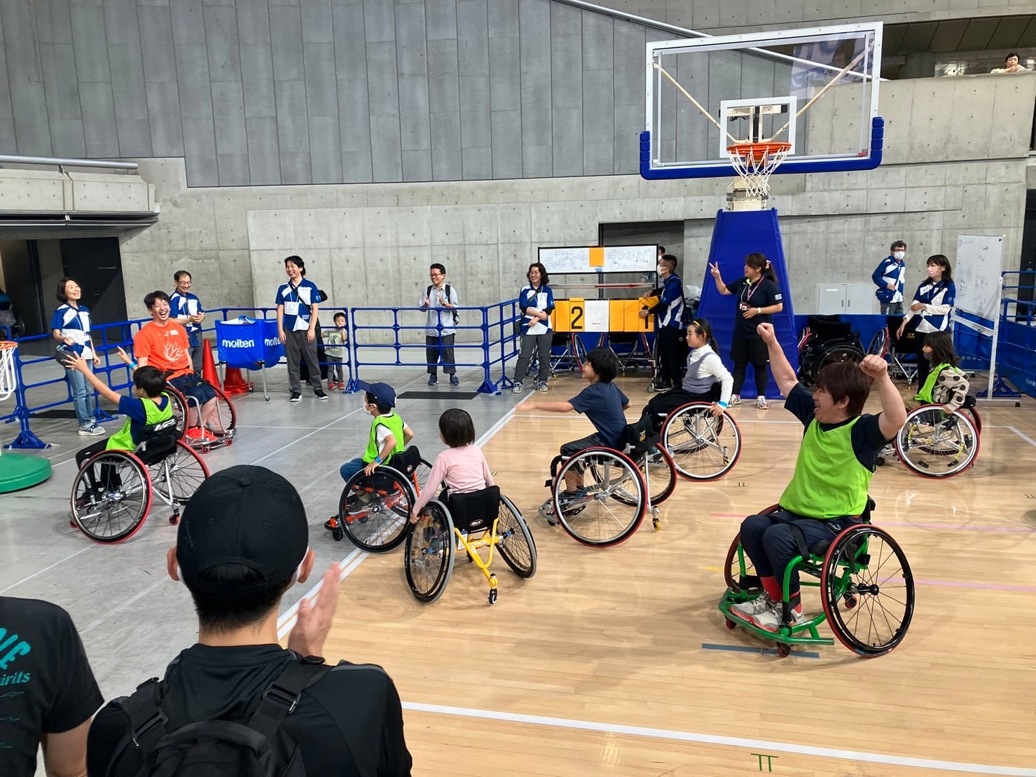 シュート体験は長蛇の列が出来るほどの大人気!車いすバスケットボールの橘貴啓選手やパラ応援大使の根木慎志さん(シドニー2000パラリンピック出場)によるデモンストレーションや、来場者のミニバスケ対決で大いに盛り上がりました。