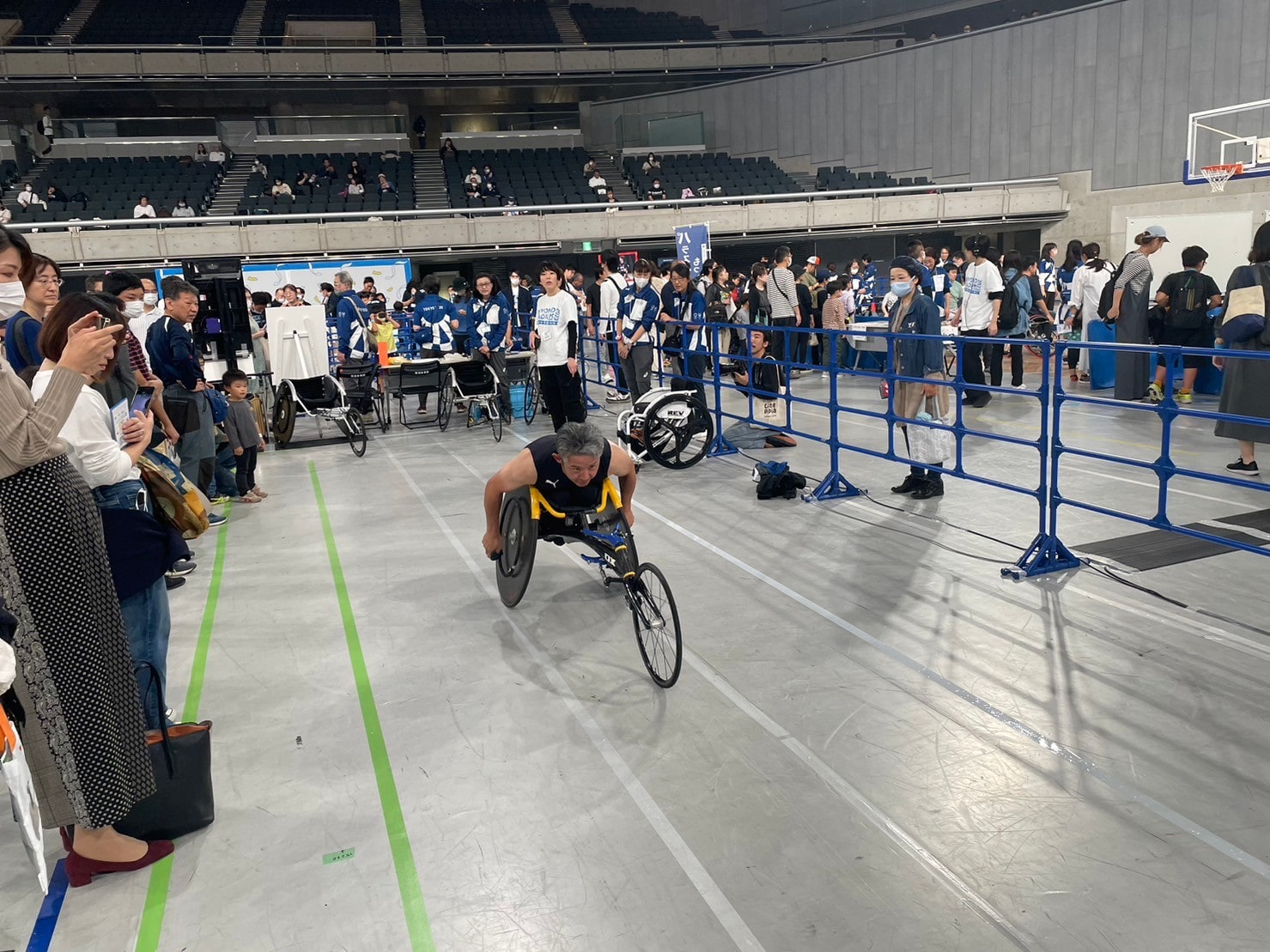 車いすレーサー体験ではパラ応援大使の花岡伸和さん(アテネ2004/ロンドン2012パラリンピックマラソン入賞)が登場。デモンストレーションのあと、車いす操作のコツを参加者にレクチャーしてもらいました。