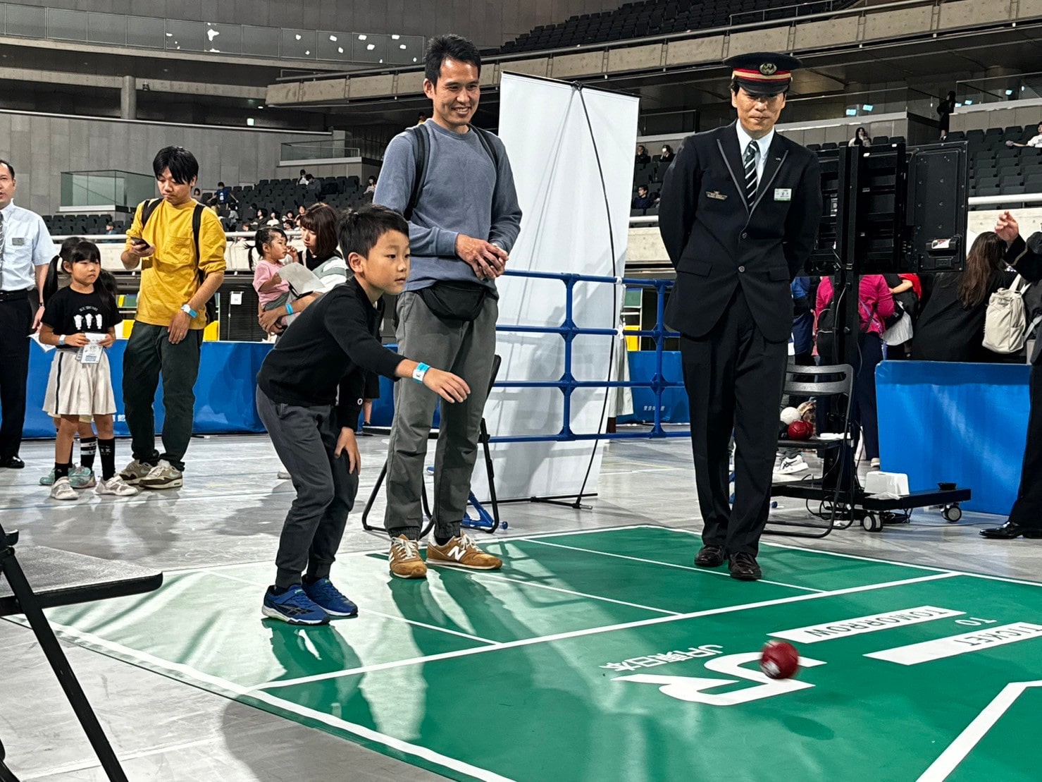 体験エリアには車掌・運転士などの制服を着た社員の方がたくさん!初めて体験する方にはレクチャーしながら、時には来場者の方と対戦、待機列のお客さんも応援しながら一体となって大盛り上がり。だれでも気軽にチャレンジしやすいボッチャならではの体験コーナーとなりました。