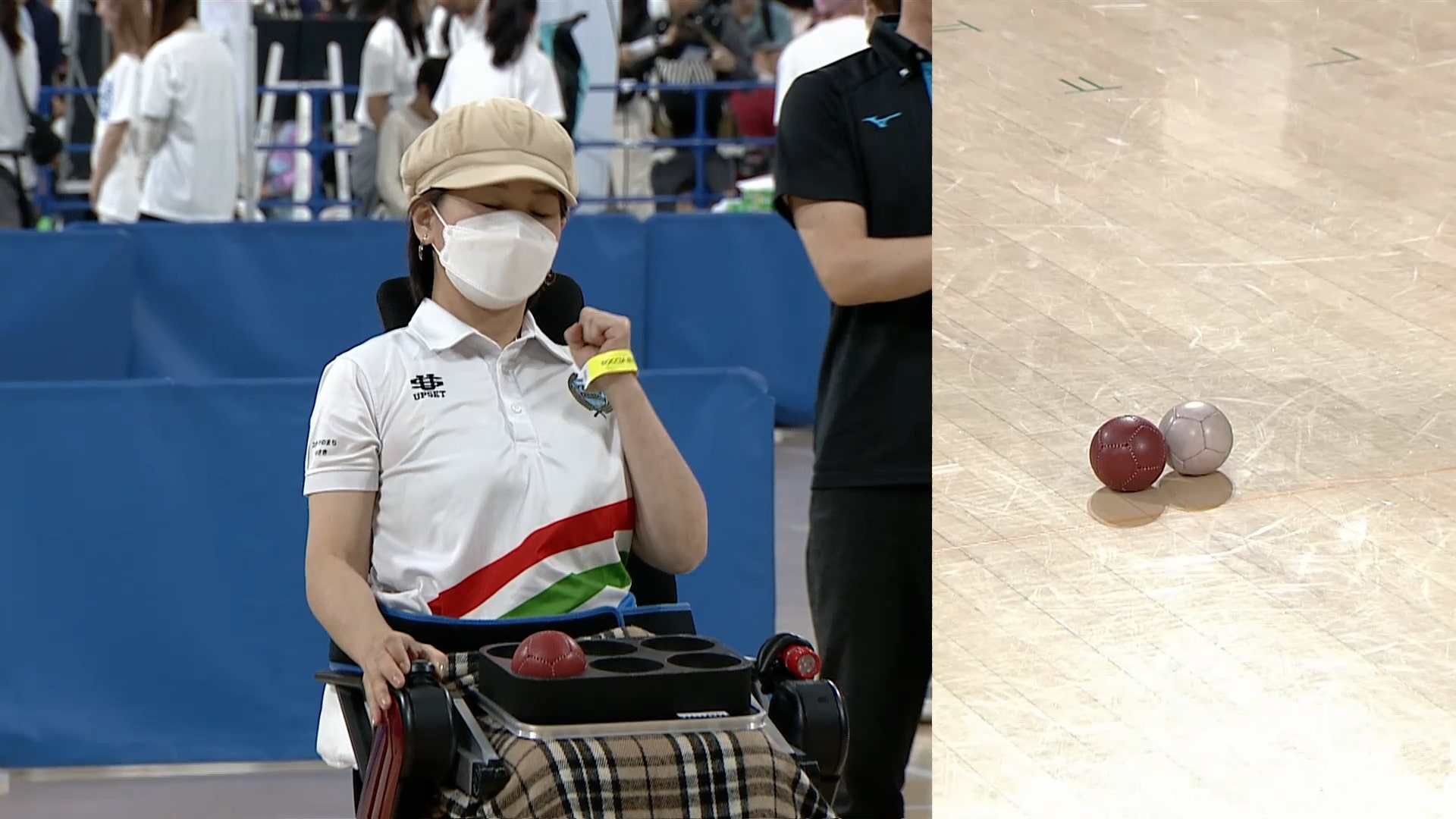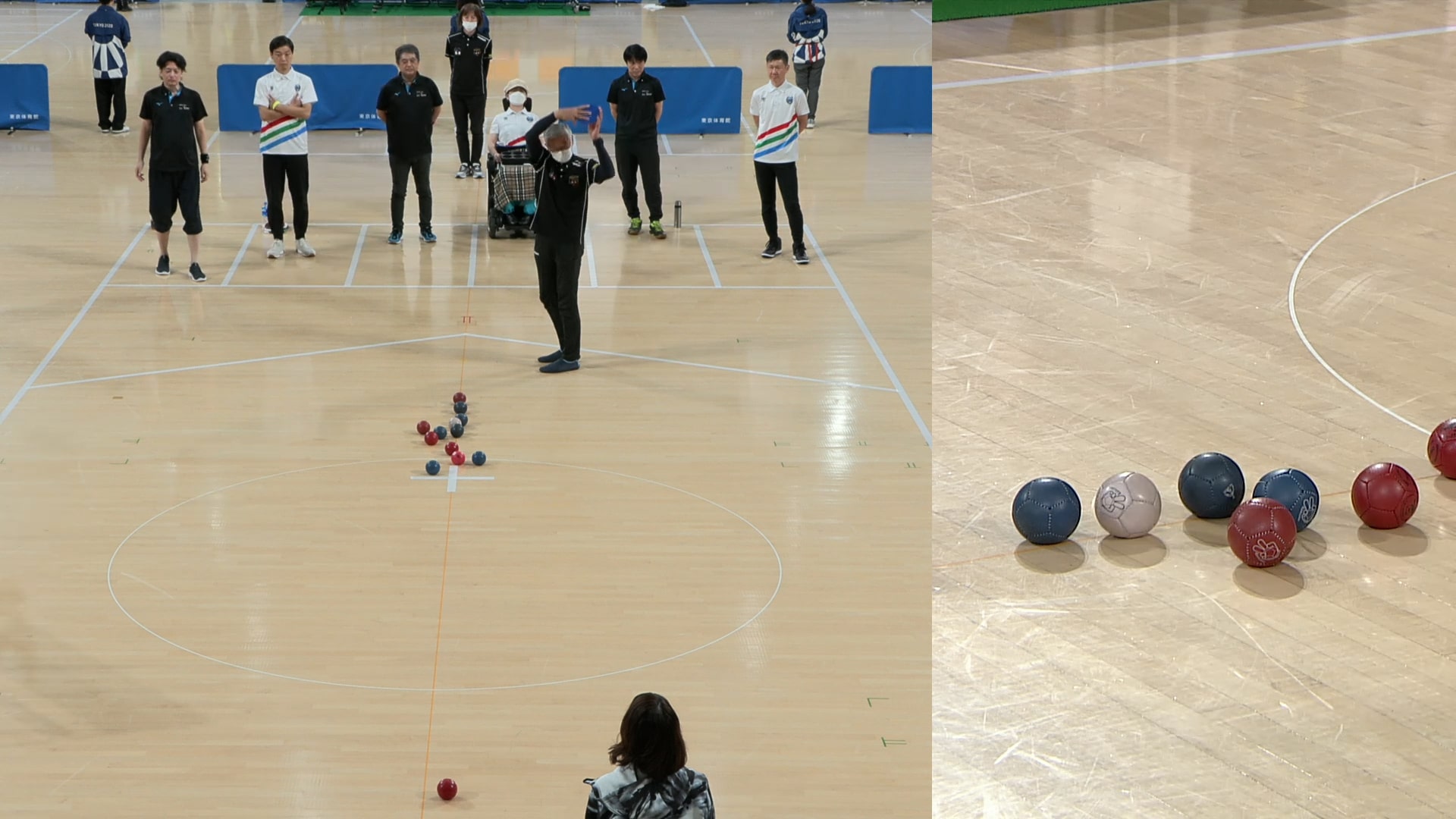 日本ボッチャ協会の新井大基さんとアイドルグループ仮面女子のメンバーで、パラ応援大使の猪狩ともかさんの実況・解説が入り、4エンドでのガチンコ対決となりました。