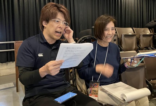 当日は、観戦ナビゲーターでスポーツライターの宮崎 恵理(みやざき えり)さん、ゲスト解説者として選手であり日本車いすラグビー連盟・普及部長でもある峰島 靖(みねしま やすし)さんをお迎えし、今大会の見どころや注目選手など観戦ポイントを解説いただきました。峰島さんはNHKのパラリンピック放送や、様々な大会の場内実況の解説者として、活躍されています!このリポートでは観戦会の模様を試合の結果や選手の声と共にお届けします。