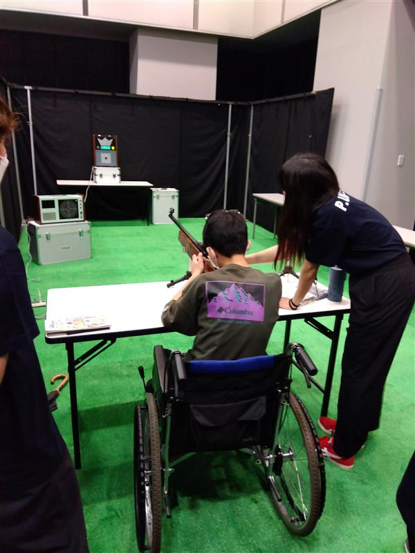 次は、上山選手、大江選手、関口選手が、的の大きさが5㎝、3㎝、1㎝と徐々に小さくなるエキシビションマッチにチャレンジ。「パラリンピックより緊張する」と話していた大江選手は、5㎝と3㎝に見事命中。