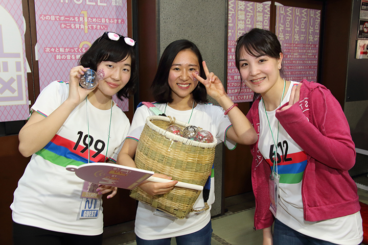 「放課後BEYOND」ブースの中心である「ゴール煩悩」は、「本当に必要なものは⽬に⾒えなくてもわかるはず。⼼の眼と鈴の⾳を頼りに、本当に欲しいものをつかみとろう」というコンセプトで、ゴールボールへの垣根を低くして、楽しく気軽に体験してもらうためにアレンジしたゲームとなります。ゴールボールは、鈴の入ったボールを互いに転がしあい、相手ゴールに入れて得点を競う対戦型競技で、選手がアイシェード(目隠し)を着けて見えない状態でプレーするのが特徴です。「ゴール煩悩」もアイシェードをして目をふさぎますが、対戦型ではなく、次々と転がってくる「煩悩ボール」を鈴の音を頼りに取って、背中のかごに入れていきます。ボールに書かれている「愛」などの文字が、本当に欲しかったものを表している?! という、ゲーム感覚の楽しさに会場は大賑わいでした。