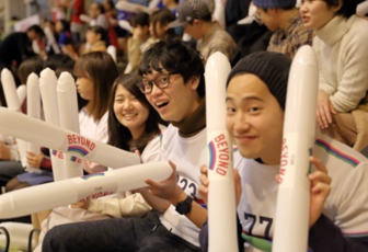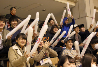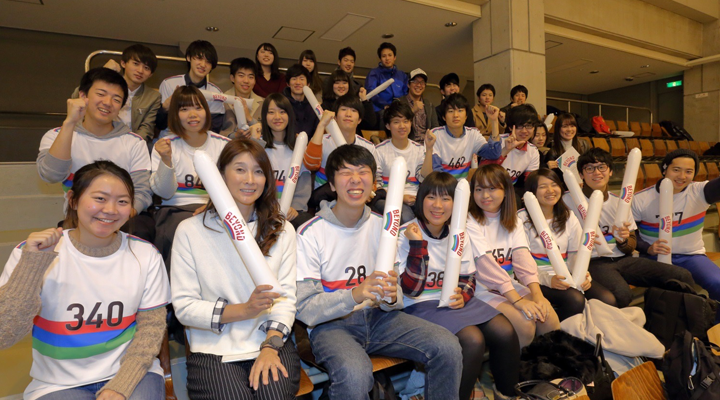 今回、パラトモ!プログラム シッティングバレー編に参加したのは、TEAM BEYOND学生メンバーの「放課後BEYOND」。学生36名が、会場に応援に駆けつけました。放課後BEYONDのメンバーは、TEAM BEYONDのそろいのユニフォームに身を包み、スティックバルーンを手に声援を送りました。