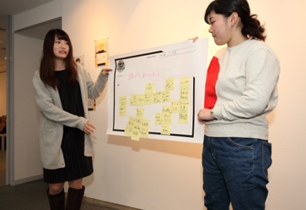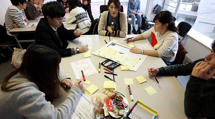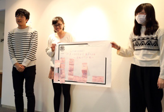 「大学生の特徴や“あるある”、好きなモノやコト」をたくさん挙げてもらった理由は、シッティングバレーボールを見て、体験した感覚と、若者たちのインサイトをかけ合わせることで、彼らがシッティングバレーボールを応援するようになるアイデアを見出すため。 大学生の好きなモノやコトが出そろったところで、さっそくアイデアを出し合いました。楽しい雰囲気ながらも、全員の表情は真剣そのもの。「あんなに楽しめたんだから、もっと多くの人たちにそれを伝えたい」、みんなの表情からはそんな思いが感じられました。どんなアイデアが出されたのでしょう。グループごとに発表してもらいました。
