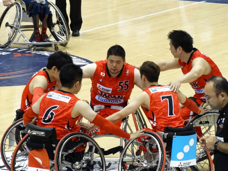 選手は個々の障がいレベルに応じて、障がいの重い順に1.0~4.5と0.5点きざみで持ち点が定められています。そして、試合中コート上の5人の持ち点の合計が14.0点を超えてはなりません。これは障がいの重さに関わらず、すべての人が試合に出られるようにするためのシステムです(選手がそれぞれ車いすの後ろにつけている旗を見ると、各選手の持ち点がわかります)。