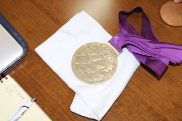 メダルを触らせていただいたが、思っていた以上に大きくて、重かった。いたって普通のコメントだが、これが金メダルの重みだ!!超かっこいい!!と感じた。